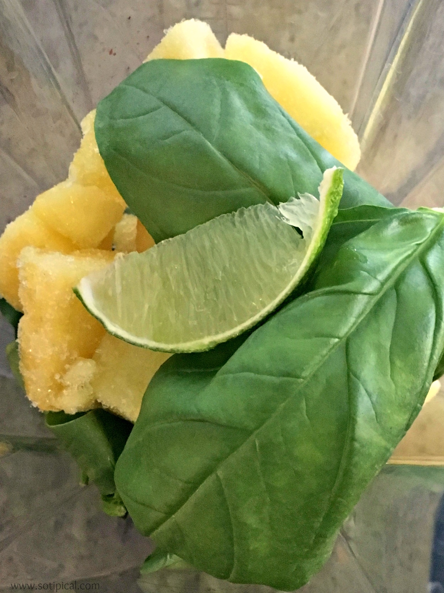 Place spinach, frozen pineapple, water and lime in your blender. (Coconut milk would also make a great substitute for the water, if you prefer a more creamy smoothie) Start on a low setting and slowly increase until mixture is smooth. I start on a low variable setting and increase to level 10. Then I switch to high setting until it is smooth in texture. Next you can add the bee pollen and honey to sweeten, if desired. You can also adjust the consistency of the smoothie by adding more or less water. I also like to use frozen fruit to avoid adding so much ice. I find that it waters down the smoothie too much for me. I buy a variety of organic frozen fruit at the membership warehouse, but you can certainly freeze your own.