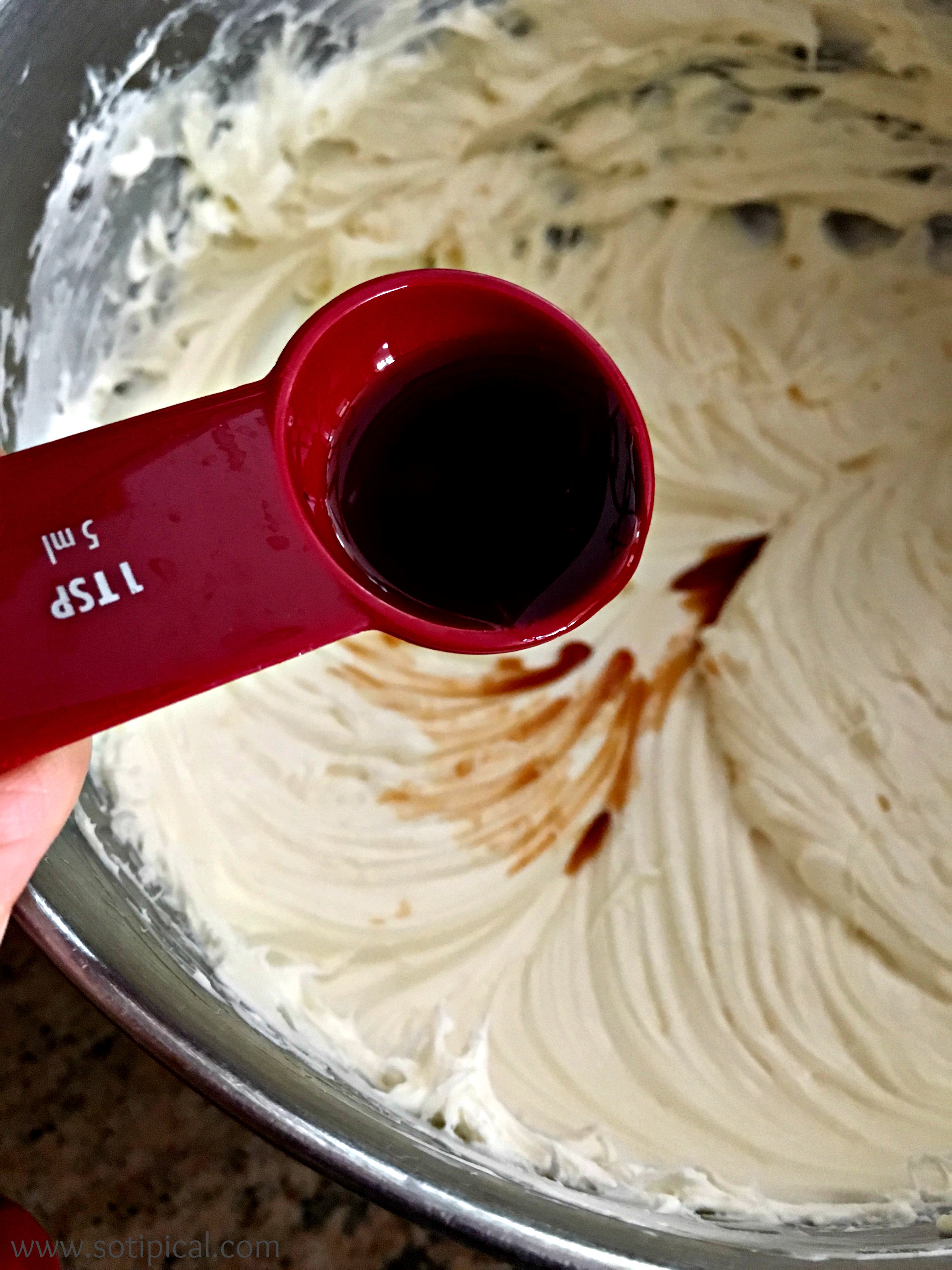 Next you will slowly drizzle in the sweetened condensed milk, then add the vanilla. Whip until it is well blended.