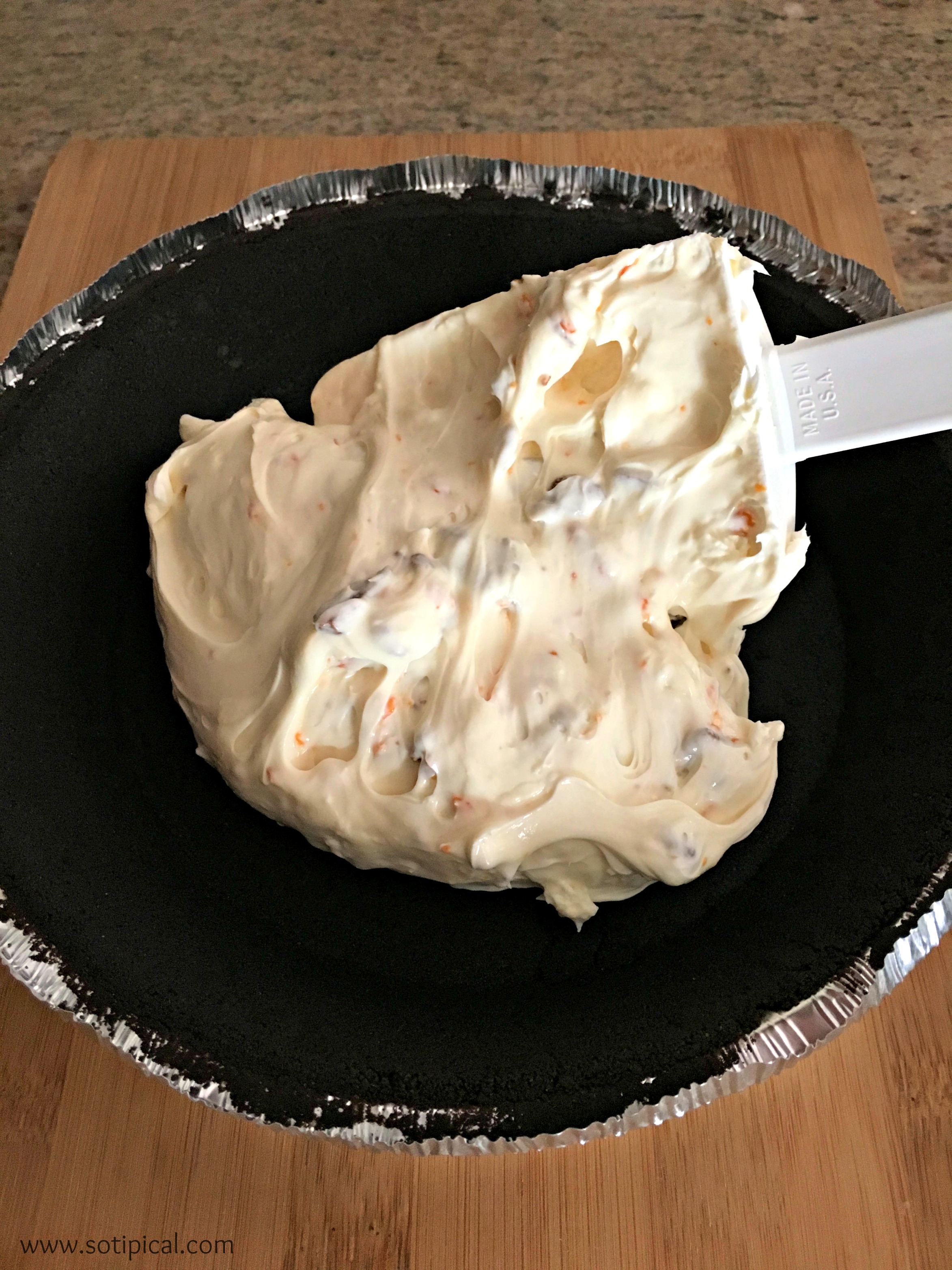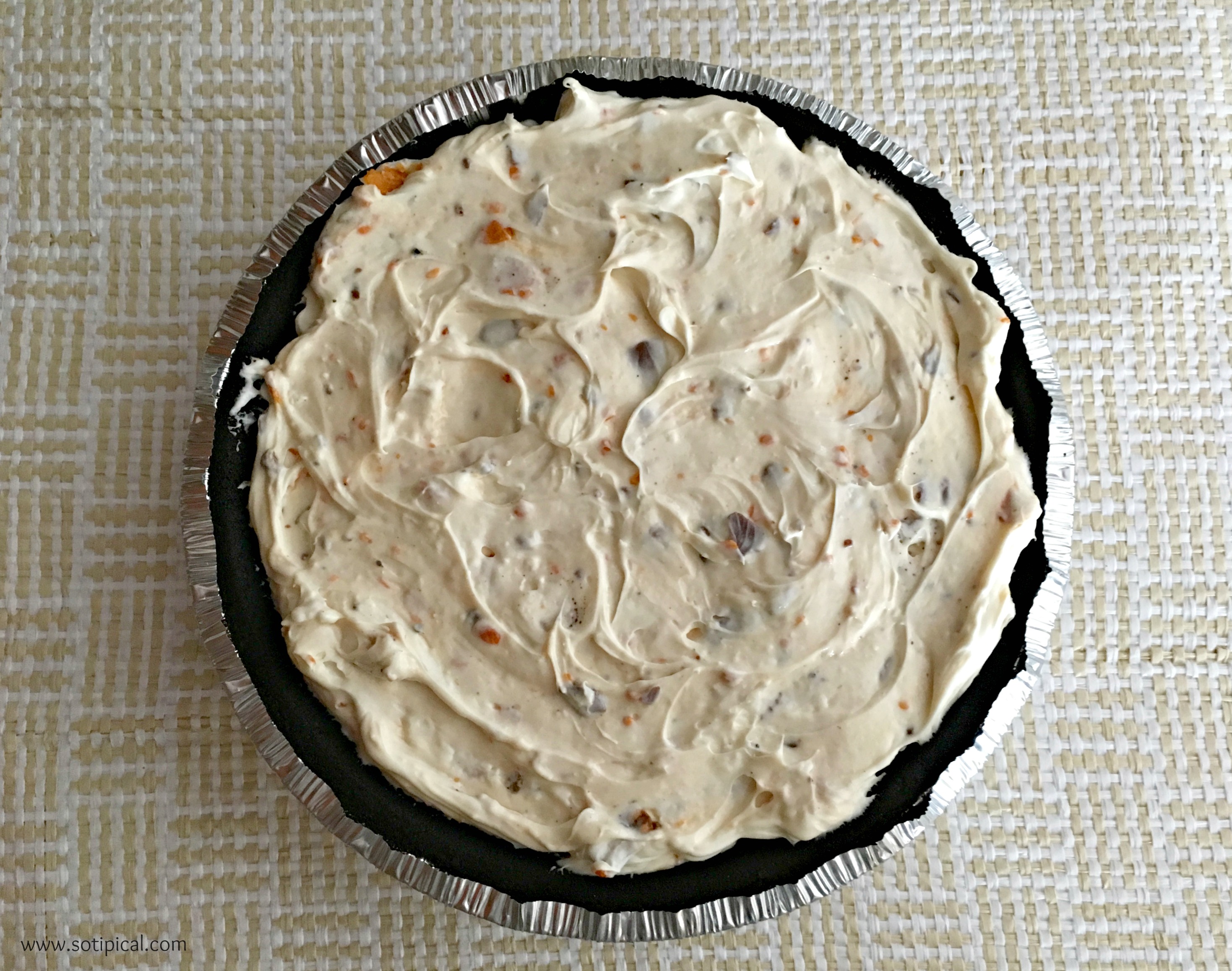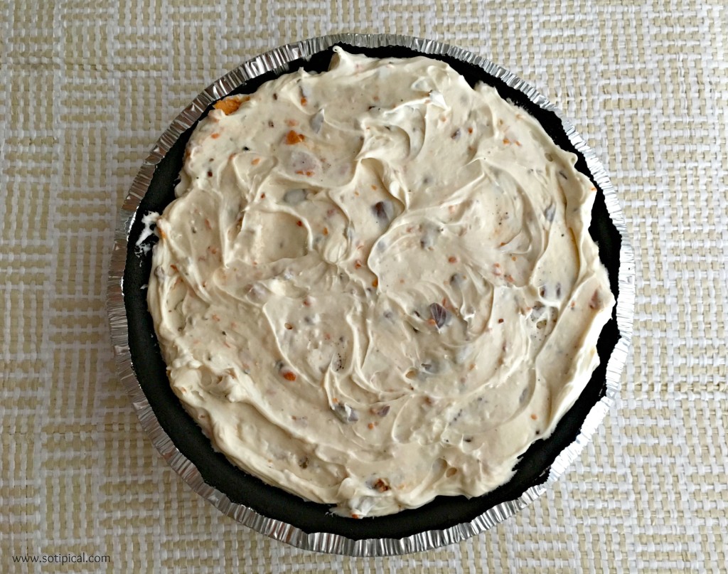 In order to save prep time, I decided to purchase a ready-made chocolate pie crust. You can certainly make your own, or even use a graham cracker crust. (Homemade crust is made with finely crushed cookies mixed with melted butter, then pressed into your pan.) I thought the chocolate would add a nice balance in the flavor and it did! Carefully add the blended mixture to the crust. Be gentle when spreading the mixture on the bottom. This crust was a little fragile underneath.