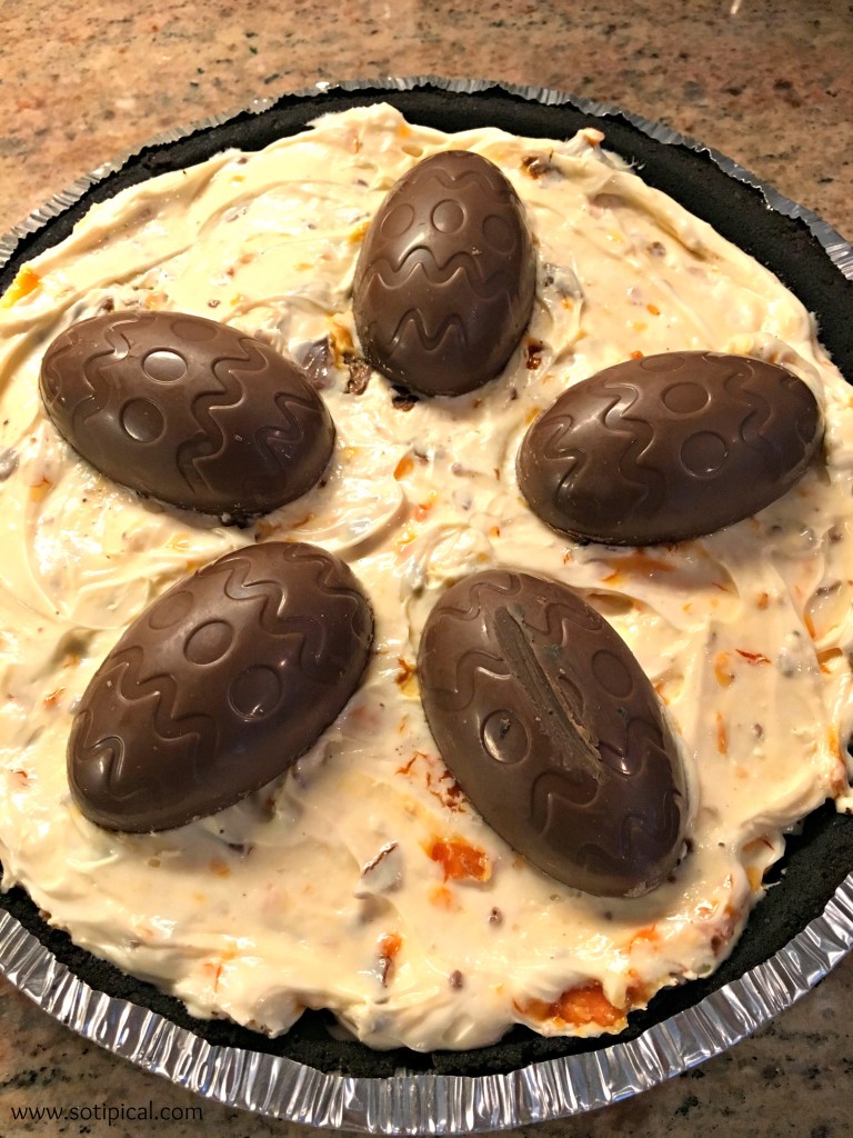 Once fully chilled, arrange your BUTTERFINGER ® Cup Eggs 6pk in a starburst on top. I used 5 of them.