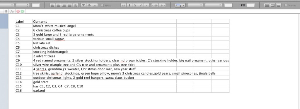 Once we were ready to pack everything up, I decided to follow the system my husband uses whenever we have moved in the past. As a box is packed, the detailed contents are listed on a spreadsheet. The box is then assigned a letter. In this case, they all have a “C” for Christmas. (When we moved, the letter(s) referenced the room it belonged to: K, LR, B, BR, etc) Then we numbered each box. Here is an example: