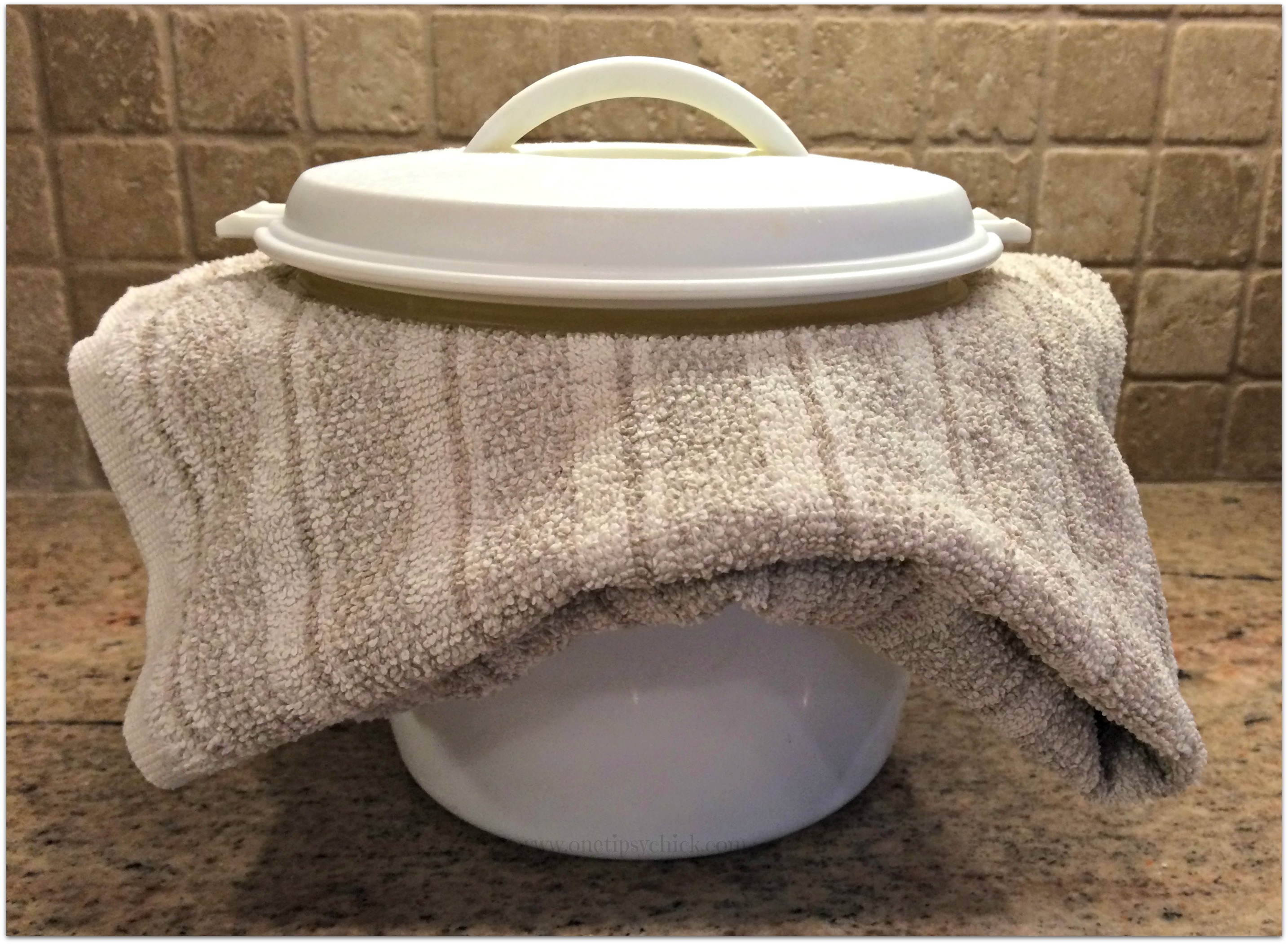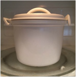 So I cooked my rice, and 14 minutes later, I removed it from the microwave, took off the two-piece lid and placed a folded dish towel over the rice. Then I tightly wedged the lid back on as tightly as I could.