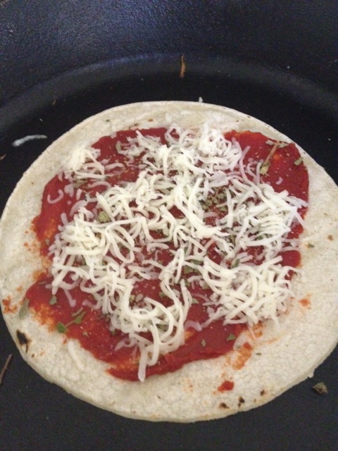 My kids are on a corn tortilla and pizza kick lately, so I combined both. I heated the corn tortillas in a skillet first. Then I added tomato paste, oregano, garlic powder and cheese. We usually add pepperoni, but we were out.