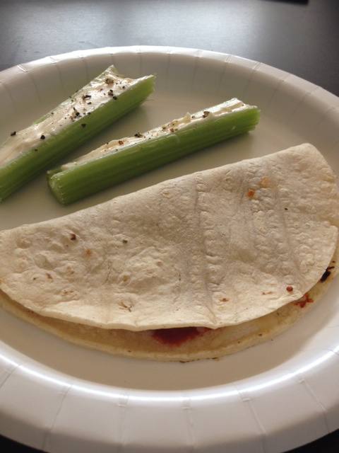 Monday’s after school snack: A Pizzadilla, Celery with Cheese and a Frosty Strawberry Lime Tea.