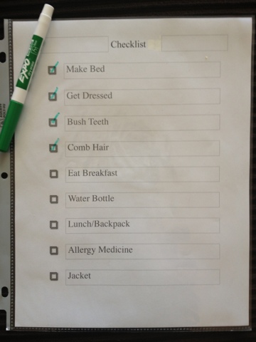 I made this simple check list and hung it in a plastic sleeve with a dry erase marker. This way they can run down the list each morning and stay on track with our routine.