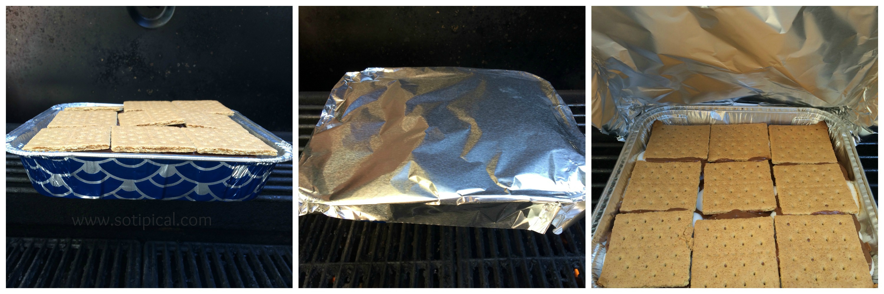 While your grill is set on low, begin by coating the inside of the aluminum pan with cooking spray, to avoid sticking. Begin with a layer of Graham Cracker Squares on the bottom of the pan. I used a 9 x 9, and I was able to fit 3 rows of 2 squares. Then break then add half a chocolate bar on top of each square.