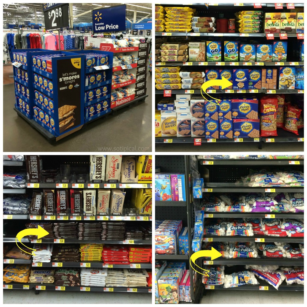 One thing that I found recently, and really like, is the Honey Maid Graham Cracker Squares. If you haven’t tried them before, they are great for s’mores! You can find them exclusively at Wal-Mart. Here is where I found them, along with the Hershey’s Milk Chocolate Bars and Kraft’s Jet Puffed Marshmallows!