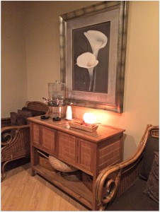 Once I changed, there was a quiet room available to relax in while I waited for my treatment. Water and snacks are available as well. The lighting was low and there were several chairs with soft pillows.