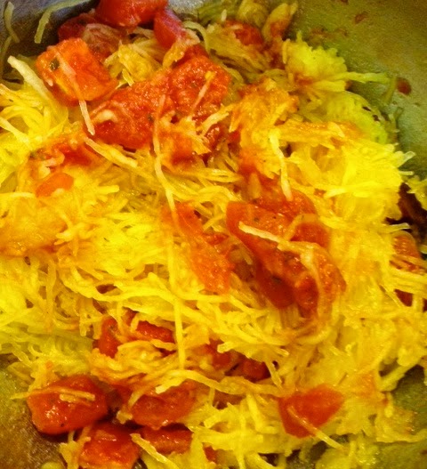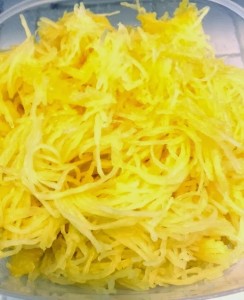 First cook your spaghetti squash. I do this but cutting it lengthwise and removing seeds. Place faced down in a pan with about 1 inch of water. Bake at 375deg for about 30 minutes or until you can easily pierce the skin with the end of a knife. Remove from pan and once cooled, use a fork to remove the squash from the skin. It will come out in strings, like spaghetti. Discard skin and set aside.