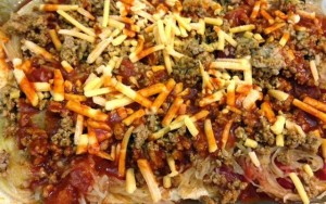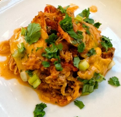 Now it is time to start layering. Coat the bottom of your pan with a thin layer of enchilada sauce. If you are choosing to use the tortillas, then coat them with sauce and cover the bottom of your pan with a single layer. To ease the family into this dish, I opted for a top and bottom layer of corn tortillas so it more closely resembled a typical enchilada casserole. Then add alternating layers of squash, meat, sauce and cheese. Pour sauce over the top, add more cheese, chopped onions and cilantro.