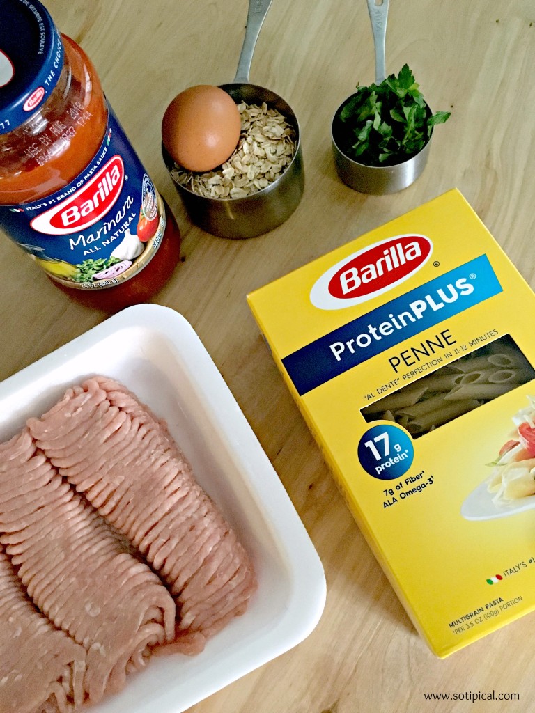 Form the mixture into a “loaf” in the baking pan. Sprinkle any remaining chopped parsley over the top and bake for 40-50 minutes. While the meatloaf is baking, prepare the pasta as directed, then mix with desired amount of remaining marinara sauce.