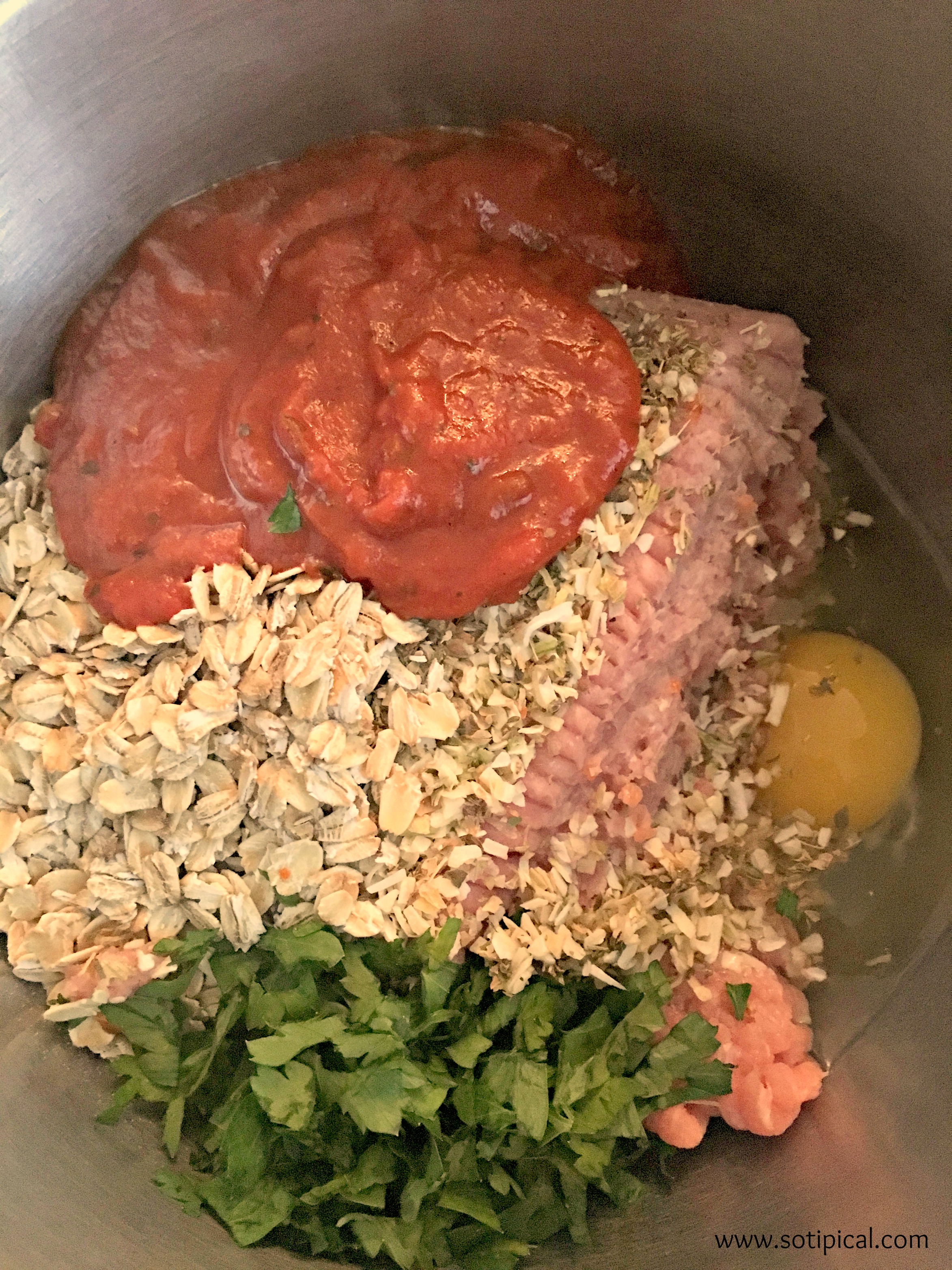 In a large bowl, combine the ground turkey, marinara, onion and parsley. Next add the last and beaten egg. Once you have mixed the ingredients together, season with salt, pepper and Italian seasoning. If desired, add in the red pepper flakes.