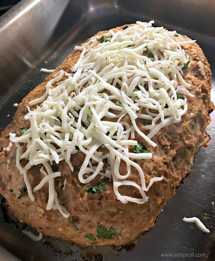 In the last 5 minutes of baking, add mozzarella over the top of the meatloaf, if you choose to use it. (*Sometimes I stuff the mozzarella into the center of the meatloaf when forming it. For this, I increase the amount to about 1 cup.)
