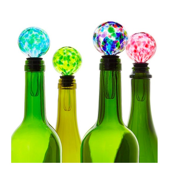 Birth Stone Wine Stopper – Designer Jill Henrietta Davis heats clear glass to 2,000 degrees, then rolls in bits of crushed colored glass before forming the vibrant globe.