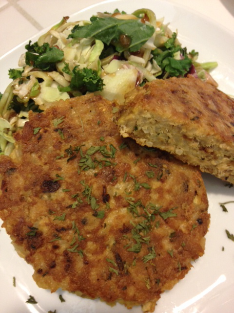 Mix all ingredients well and form into patties. Heat pan over medium heat and add oil for frying. When hot, cook until the patties are cooked about half way up from the bottom, then flip. They will cook for approx 4 minutes per side.